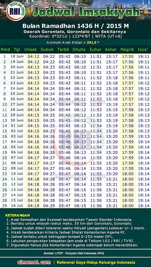 Kesimpulannya, mengikuti jadwal sholat Gorontalo tidak hanya bermanfaat untuk kehidupan spiritual tetapi juga dalam menjaga keseimbangan hidup. Dengan memiliki rutinitas yang teratur, Muslim di Gorontalo dapat tetap produktif dan memenuhi kebutuhan ibadah mereka. Ini adalah investasi waktu yang tak ternilai harganya yang membawa damai dan kepuasan spiritual.