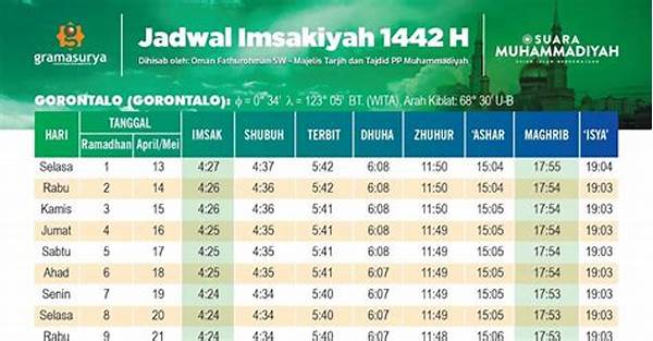 Bagi masyarakat Gorontalo, tak jarang waktu sholat menjadi topik pembicaraan hangat terutama ketika perubahan musim terjadi. Perbedaan waktu terbit dan terbenam matahari dapat mempengaruhi jadwal sholat. Memahami waktu sholat Gorontalo yang benar bisa jadi solusi efektif untuk memastikan ibadah berjalan khusyuk. Selain itu, pengetahuan mengenai waktu sholat juga membantu kita dalam membangun komitmen dan disiplin dalam menjalani aktivitas sehari-hari. Tak sedikit juga dari kita yang mencari tahu waktu sholat Gorontalo melalui aplikasi digital guna mendapatkan informasi yang paling akurat.